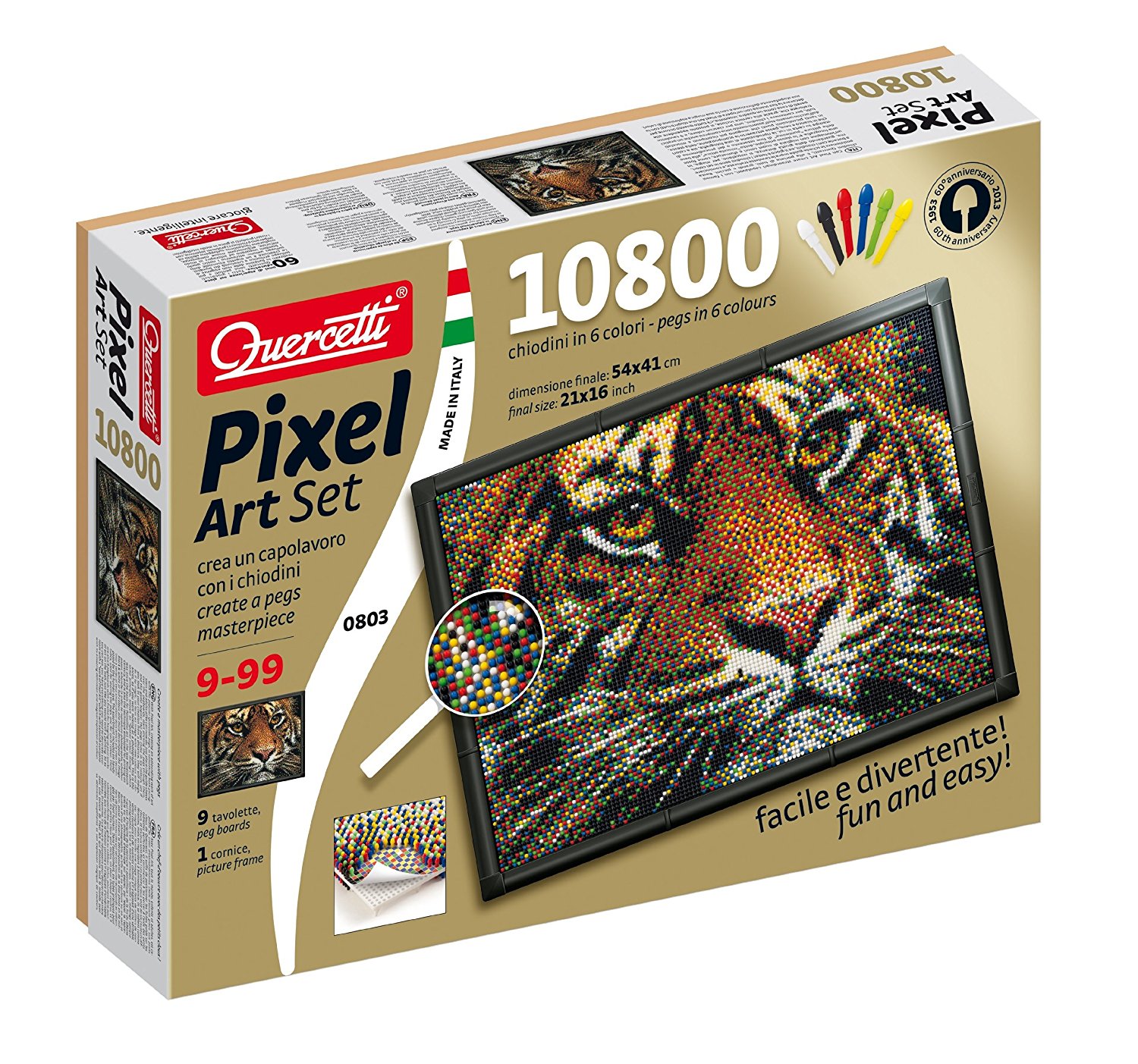 Crea il tuo capolavoro con il set Tiger Pixel Art. Basta posizionare la scheda modello sulla tavoletta forata e incollare il colore corrispondente. Le schede modello rivestite di colore rendono facile seguire il disegno. I chiodini sono disponibili in sei colori. Tuttavia, una volta completata la pixel art, appare un'ampia gamma di colori. Il set include 9 tavole forate, una cornice, 9 schede modello rivestite di colore e 10.800 chiodini in 6 colori.